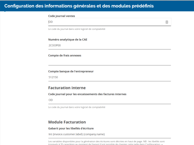 ConfigurationModule VentesComptabilité : Écritures de ventesFactures internesConfiguration des informations générales et des modules prédéfinisRenseignez le